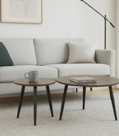 שולחנות קפה בצבע עץ שחור דגם 5008 – גימור טבעי וחמים, רגלי מתכת שחורות, עיצוב נקי, שני שולחנות בגדלים שונים, הרכבה פשוטה ונוחה.