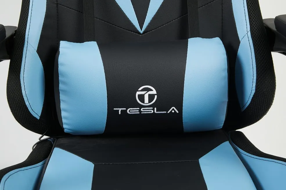 כיסא גיימינג כולל תאורת LED וכרית עיסוי חשמלית והדום נפתח לרגליים Tesla דגם 7031 בצבע כחול