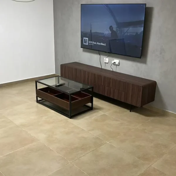 עשוי מתכת בשילוב עץ MDF וזכוכית מחוסמת בעובי 8 מ”מ וכולל 4 תאי אחסון תחתונים לניצול מקום אופטימלי