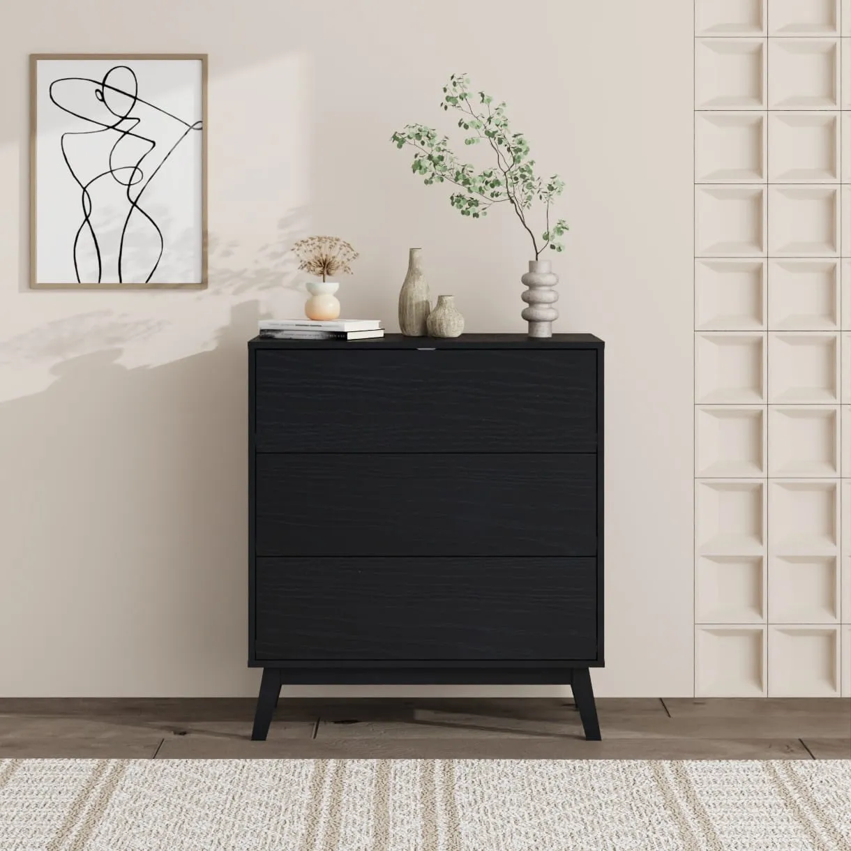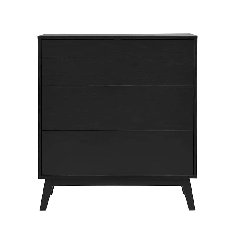 שידת אחסון איכותית עשויה MDF בגימור מלמין דמוי עץ שחור, המעניקה לבית מראה חמים ויוקרתי. השידה כוללת שלוש מגירות מרווחות לאחסון מסודר ונגיש, עם רגלי MDF חזקות המבטיחות יציבות מירבית לאורך זמן.