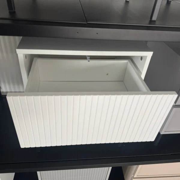 השידה עשויה מ־פלטת MDF איכותית בציפוי PVC חלק. MDF עדיף על סיבית או שבבי עץ, בזכות חוזקו ועמידותו לאורך זמן. לכן, השידה שומרת על יציבותה גם בשימוש ממושך. בנוסף, הציפוי הלבן מוסיף לה מראה אלגנטי שקל לנקות ולתחזק.
