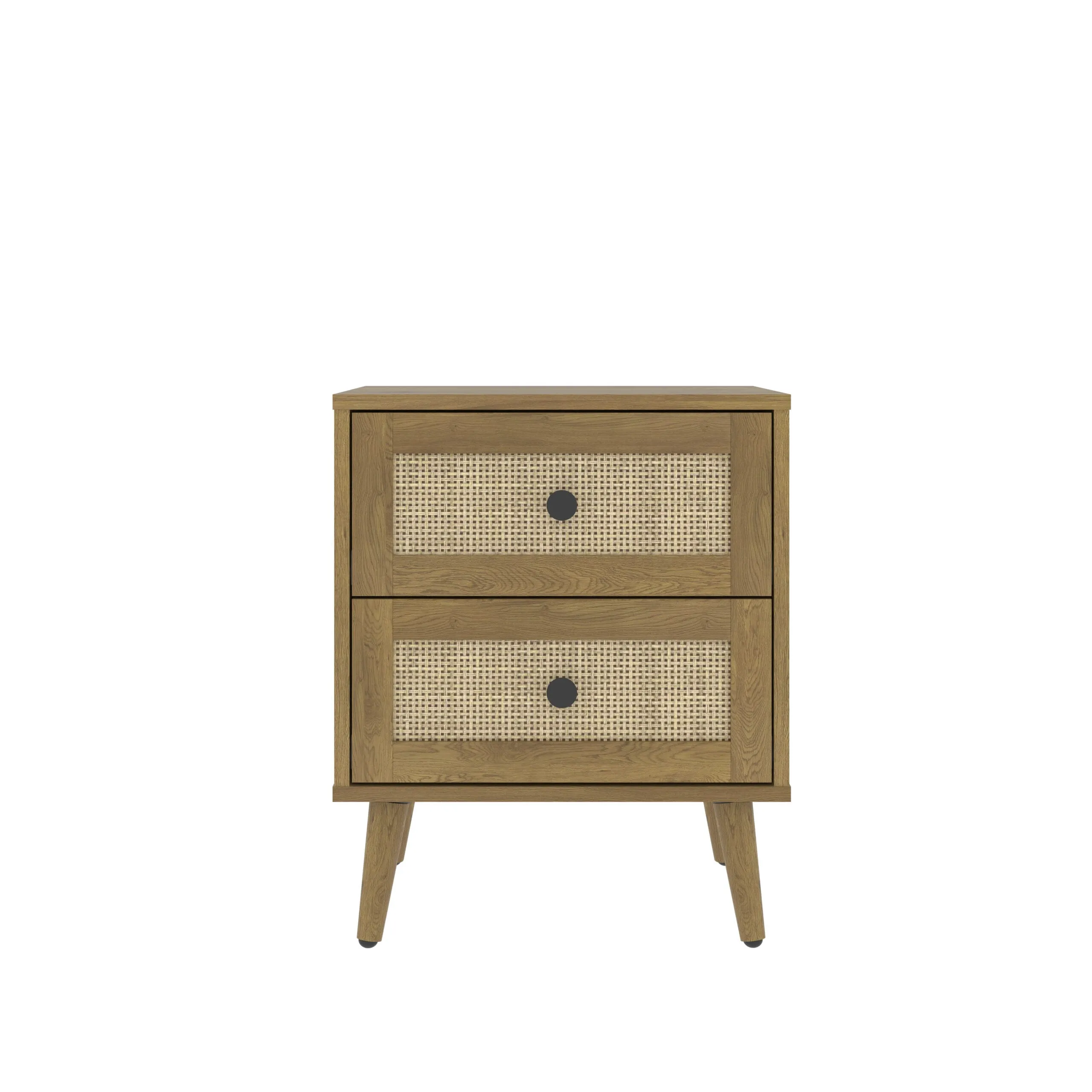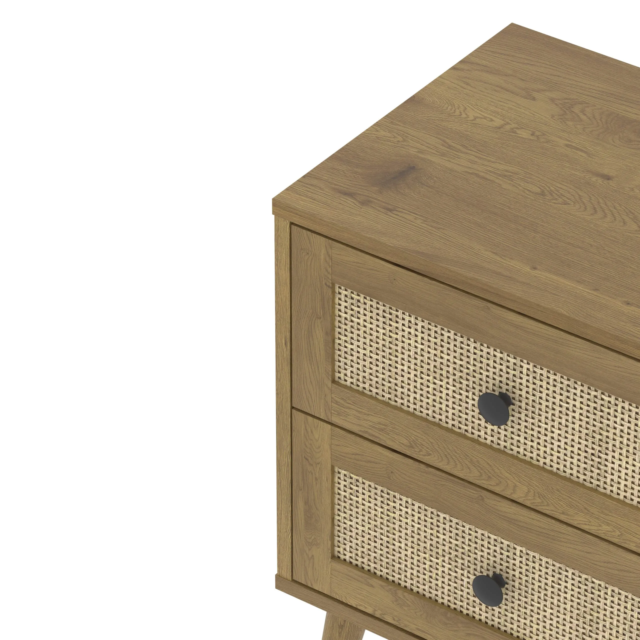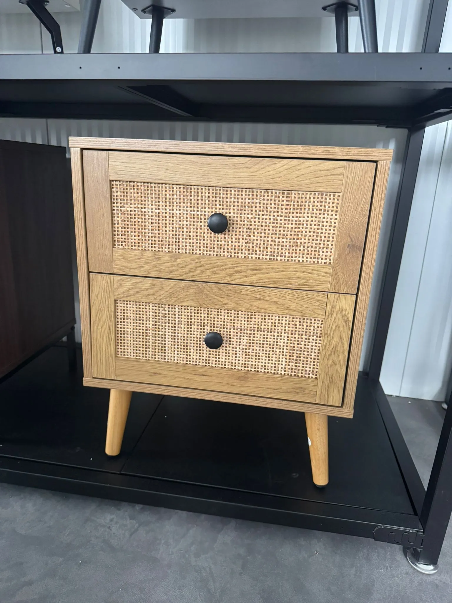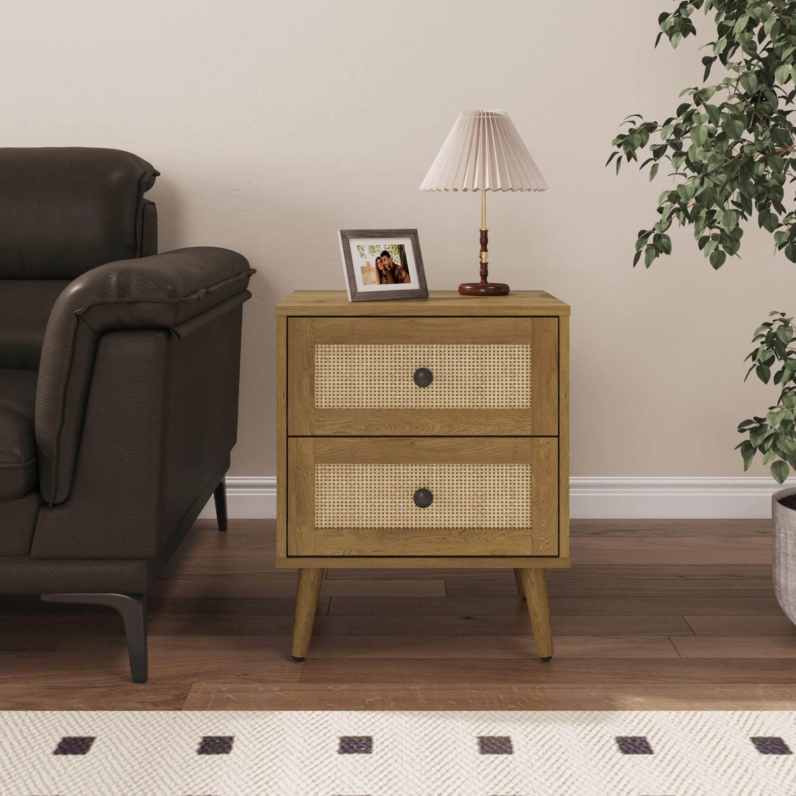 השידה כוללת מגירה בגימור ראטן טבעי המשתלב באופן הרמוני עם גוף בציפוי מלמין בגוון עץ.