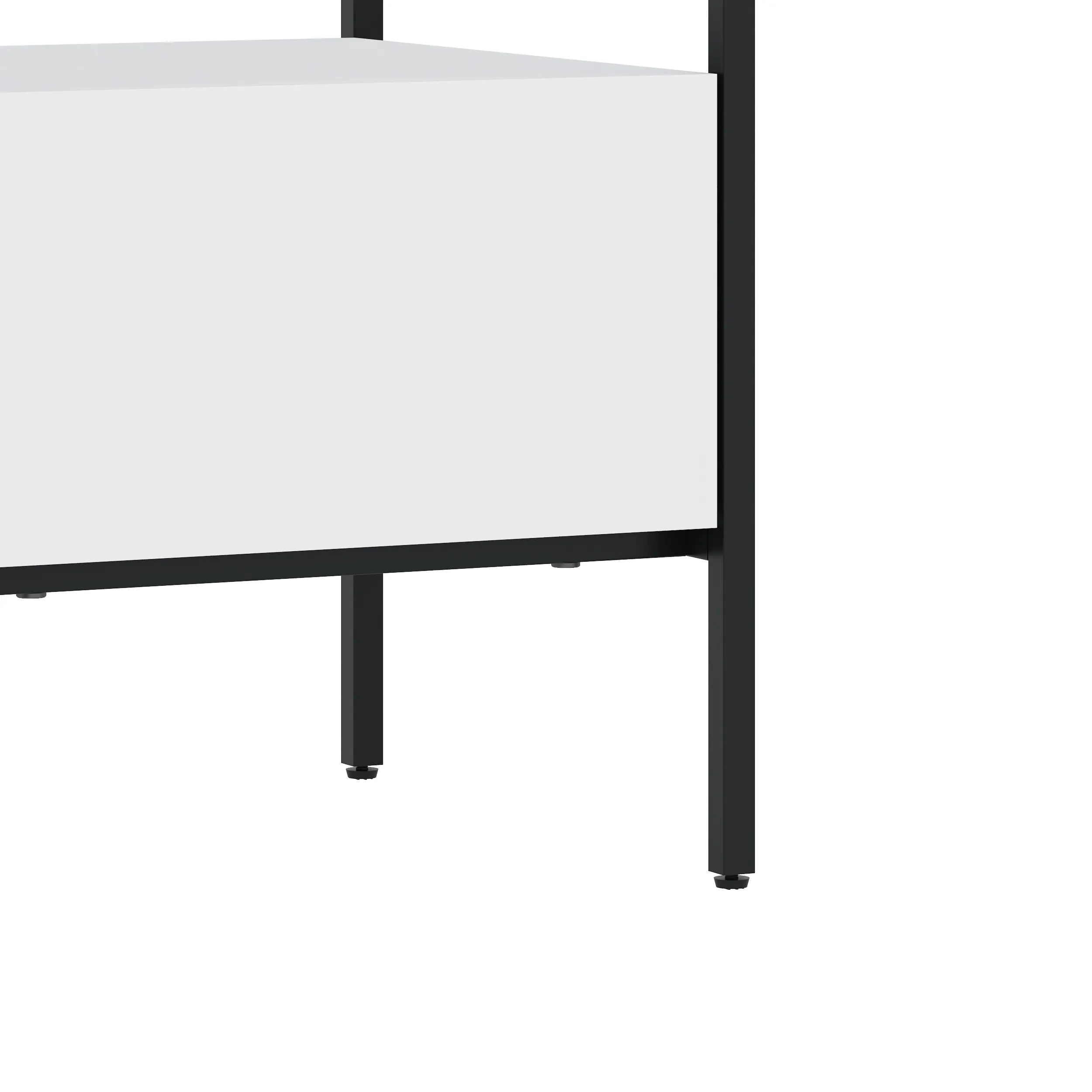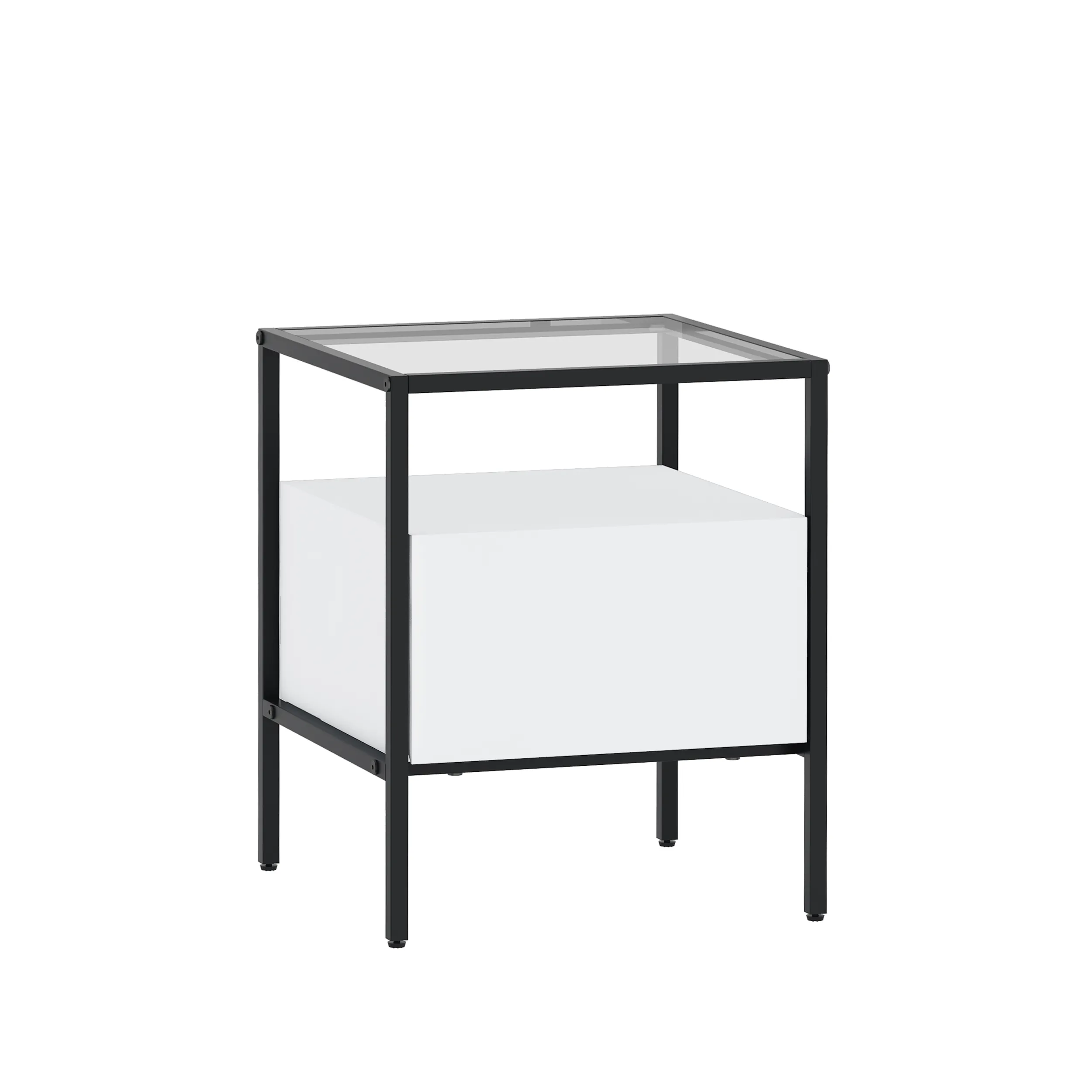 שידת לילה לבנה ומעוצבת דגם 3284 מבית Step Up, בשילוב משטח זכוכית עליון ורגלי במה ממתכת. מוצבת לצד מיטה בעיצוב מודרני ונקי.